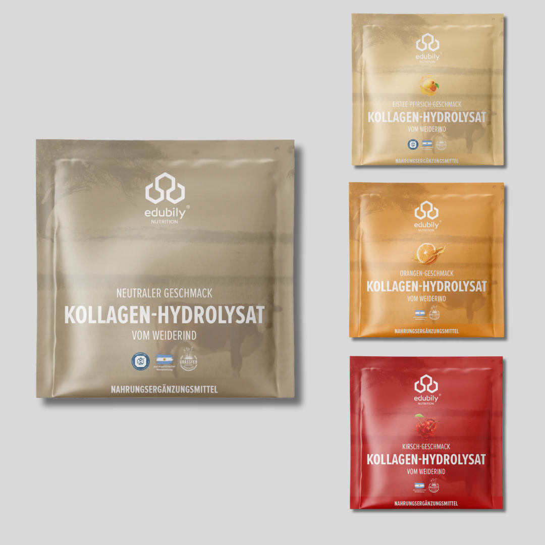 Die Kollagenproben von Edubily geben dir die Möglichkeit, zwei verschiedene Sorten kennenzulernen und die Wirkung selbst zu erleben.