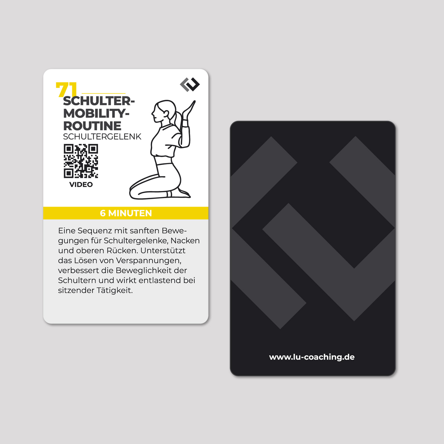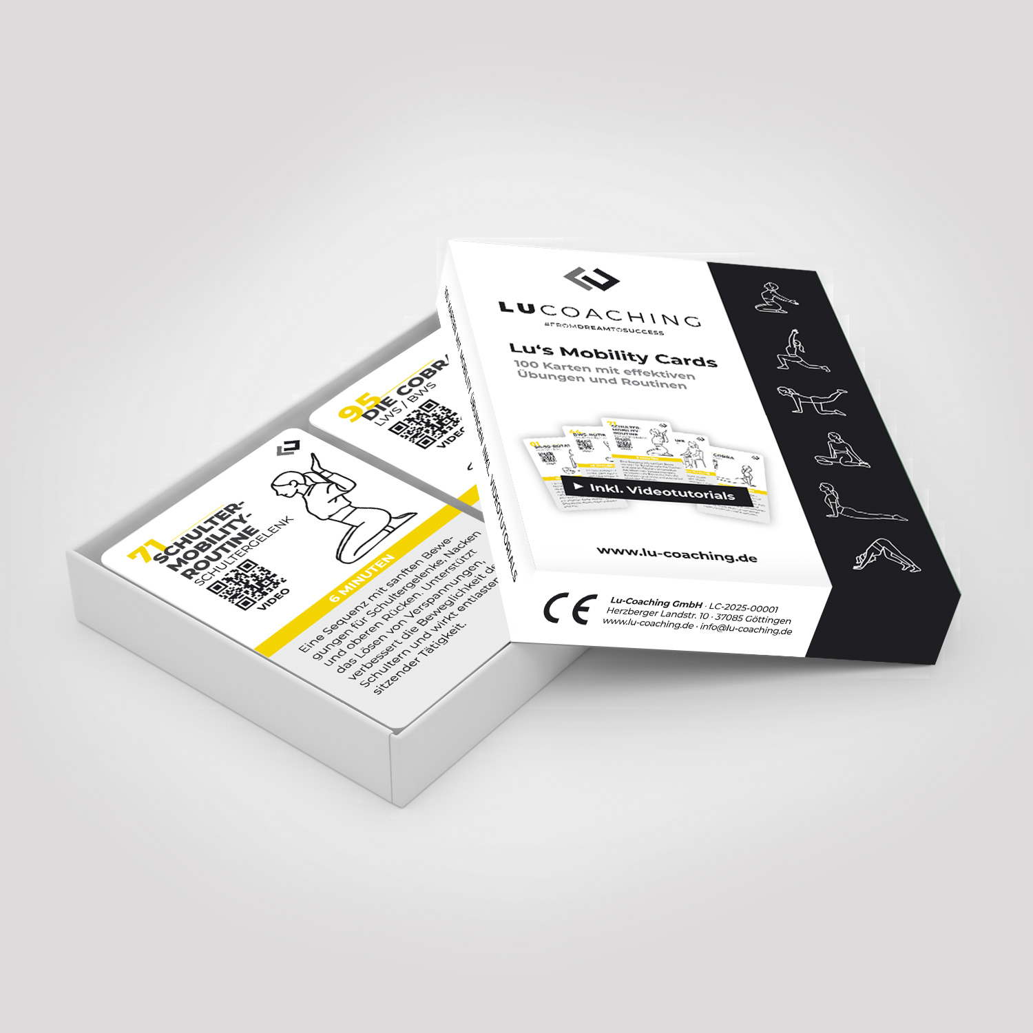 Die Lu’s Mobility Cards bieten 100 hochwertige Karteikarten mit klar illustrierten Mobility-Übungen oder vollständigen Workouts – inklusive QR-Code zu Videoanleitungen bzw. Echtzeit-Workouts. Das tägliche Zieh-Prinzip sorgt für Motivation, Abwechslung und ein strukturiertes Mobility Training, das deinen Alltag nachhaltig bereichert.