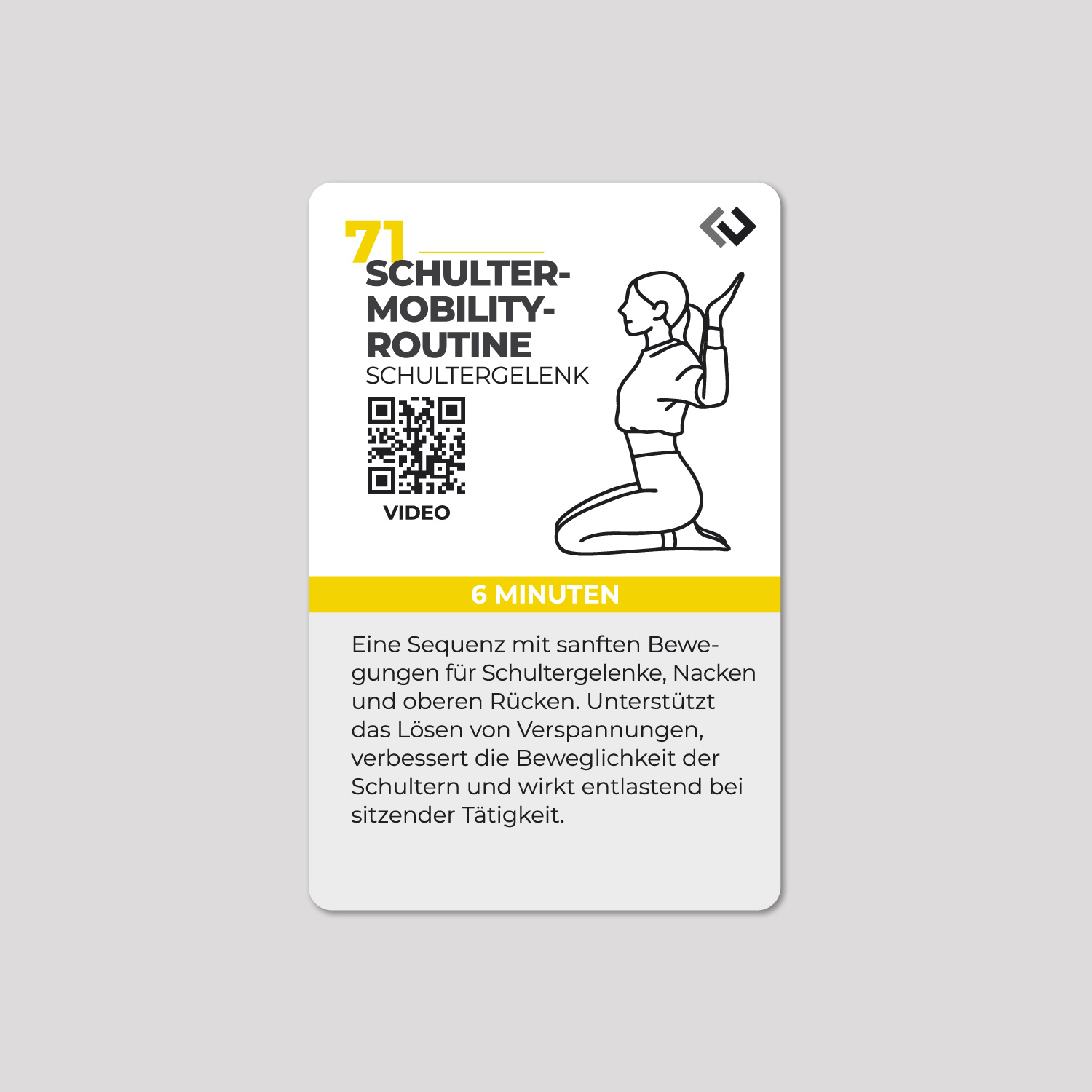 In jeder Box warten 100 liebevoll gestaltete Mobility-Karten darauf, von dir gezogen zu werden. Jede Karte enthält entweder eine Mobility-Übung oder ein vollständiges Mobility-Workout in Echtzeit zum Mitmachen – sofort einsatzbereit und intuitiv verständlich.